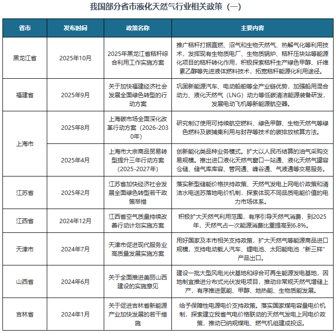 我国各省市也积极响应国家政策规划,对各省市液化天然气行业的发展做出了具体规划,支持当地液化天然气行业稳定发展,比如四川省发布的《“畅通一条江”航运振兴发展集中攻坚三年行动方案(2025—2027年)》、重庆市发布的《重庆市要素市场化配置综合改革试点行动方案》。