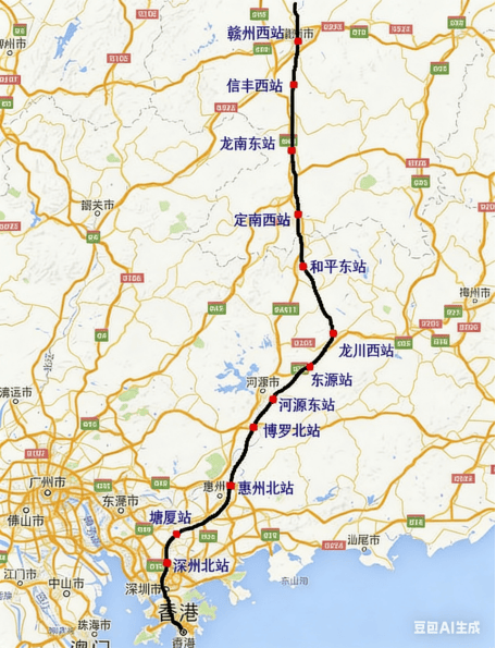 赣深高铁(京港高铁赣深段)是我国八纵八横高铁网中京港(台)通道的核心段落,北起江西赣州西站,南至广东深圳,途经河源、惠州、东莞等地,构建华中至粤港澳大湾区的快速客运通道;
