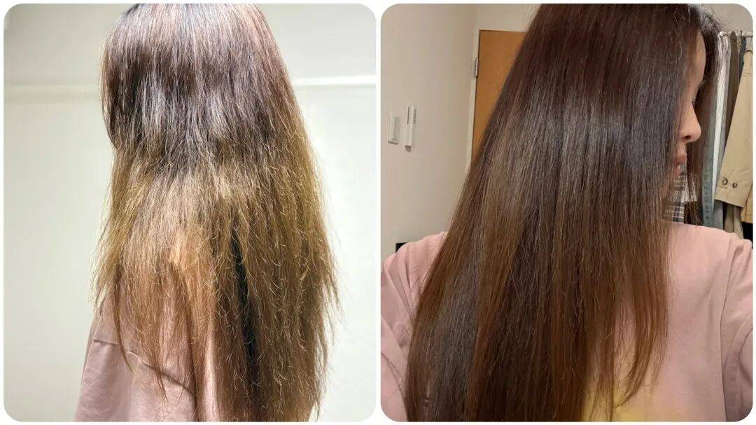你看,朋友原本又黄又毛躁的发尾用了一次这款洗发水后,明显能感觉到顺滑不少。